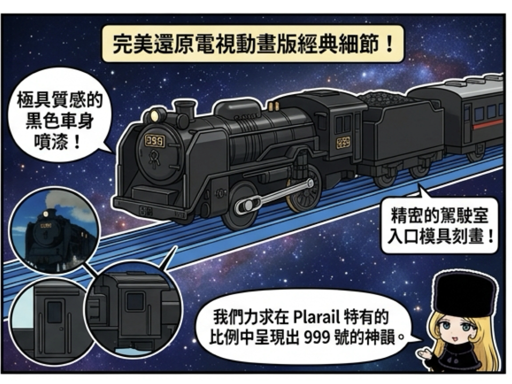 這次推出的「銀河鐵道999號」火車組合特別採用了粉絲心目中最經典的電視動畫版設計 。從極具質感的黑色車身噴漆、精密的駕駛室入口模具刻畫,到細膩的連結處設計,每一處細節都經過專業團隊精心考究,力求在 Plarail 特有的造型比例中完美呈現出 999 號的神韻 。