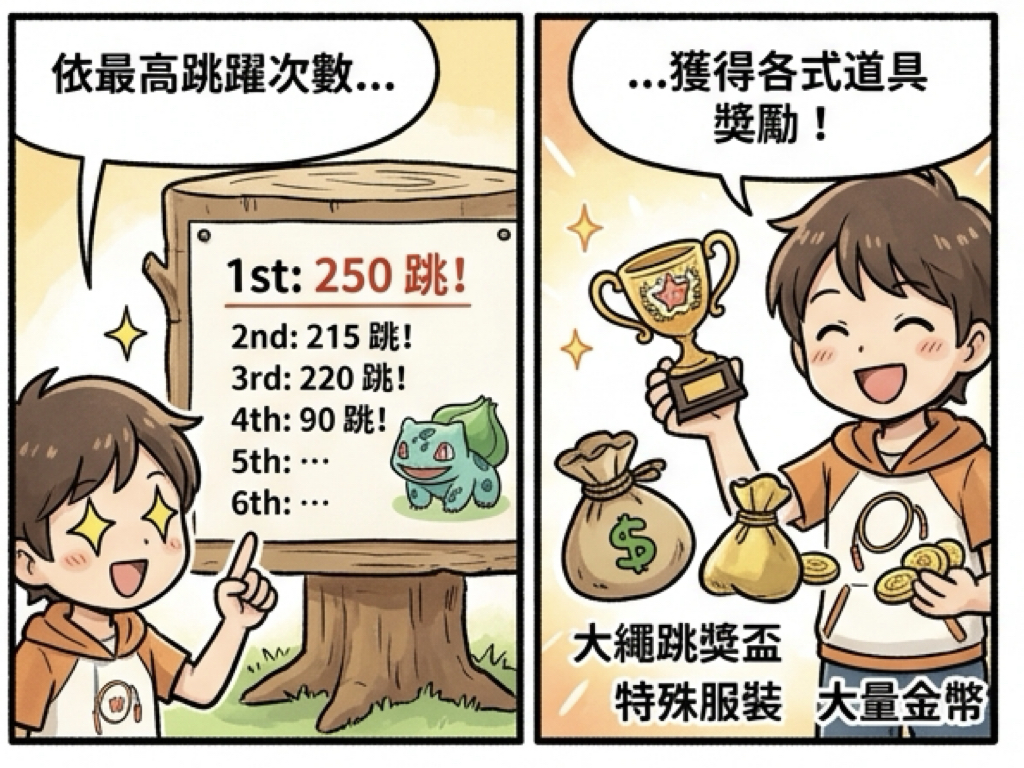 活動期間,玩家可在寶可夢中心前找到妙蛙種子,與牠對話即可參加「大繩跳比賽」。 比賽中,玩家需盡可能跳出更高的連續記錄,並依照最高跳躍次數獲得獎勵,包括 獎盃(トロフィー) 等特別道具。 (來源:turn0browsertab1)