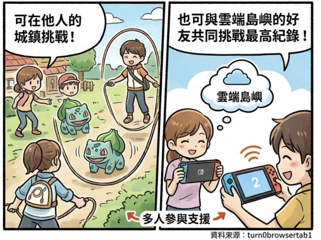 Nintendo Switch 2 遊戲《ぽこ あ ポケモン/Pokémon Pokopia》(ぽこポケ)自 2026 年 4 月 19 日起正式開放全新遊戲內活動 「大繩跳比賽(おおなわとび大会)」。玩家可在活動期間與妙蛙種子(フシギダネ)一起挑戰繩跳記錄,並依最高跳躍次數獲得各式道具獎勵。活動同時支援多人參與,無論是在他人的城鎮或雲端島嶼,都能共同挑戰最高紀錄。 (來源:turn0browsertab1)