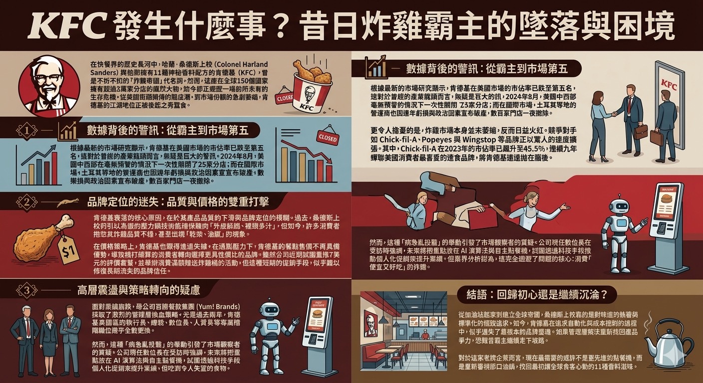 從加油站起家到建立全球帝國,桑德斯上校靠的是對味道的執著與標準化的極致追求。如今,肯德基在追求自動化與成本控制的過程中,似乎遺失了最根本的品牌靈魂。如果管理層無法重新找回產品競爭力,僅靠搬遷總部避稅或 AI 演算法,恐難以阻止這家昔日霸主繼續走下坡路。