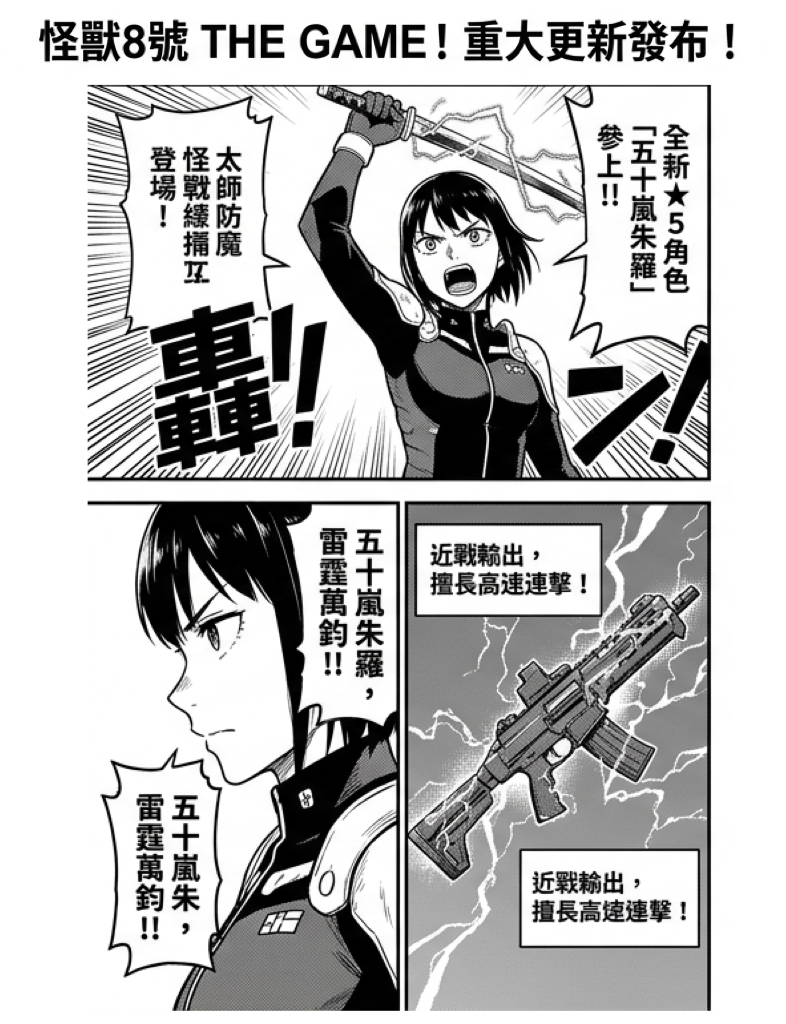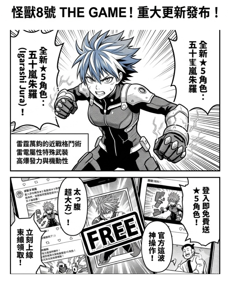 由人氣動畫改編的動作手遊《怪獸 8 號 THE GAME》正式發布重大版本更新!這次更新不僅帶來了全新原創角色——5 防衛隊員「五十嵐朱羅(五十嵐ジュラ)」,開發團隊更祭出驚人福利,所有玩家只要在更新之後登入遊戲,即可免費獲得一隻全新的 ★5 五十嵐朱羅。這場被玩家譽為「太っ腹(超大方)」的贈送活動,隨即在社群媒體引發熱烈討論。