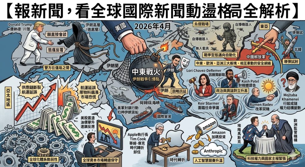 科技與產業的變局則提供另一條觀察主軸。Apple執行長Tim Cook宣布卸任,象徵一個科技時代的轉折;同時Amazon加碼投資Anthropic,顯示人工智慧競賽正加速升溫。另一方面,Elon Musk與歐洲監管機構的衝突,也揭示科技權力與國家主權之間的緊張關係。