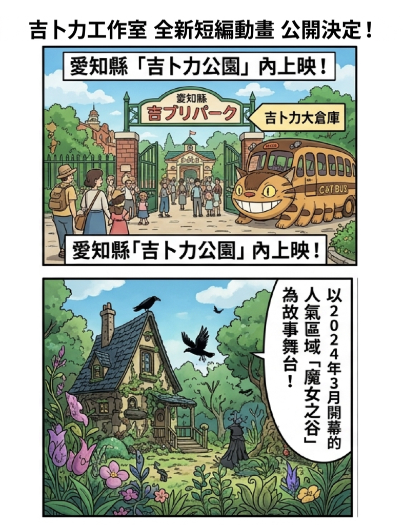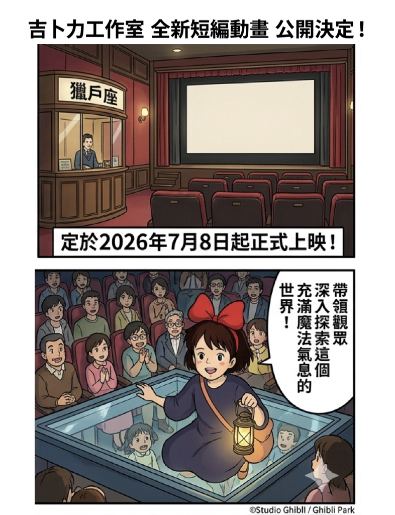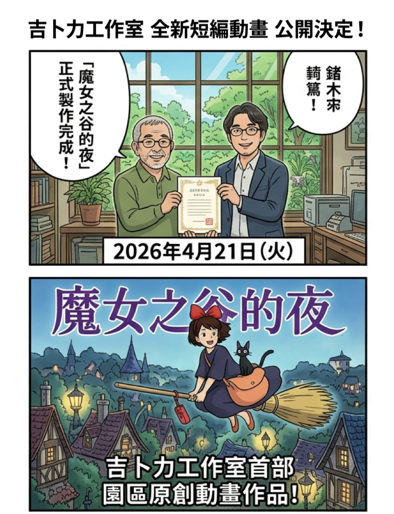 吉卜力工作室(Studio Ghibli)於今(21)日宣布,全新短篇動畫作品《魔女之谷的夜》(魔女の谷の夜)已正式製作完成,並定於 2026年7月8日起,在愛知縣「吉卜力公園」(Ghibli Park)內的「吉卜力大倉庫」影像展示室「獵戶座」(Cinema Orion)正式上映。