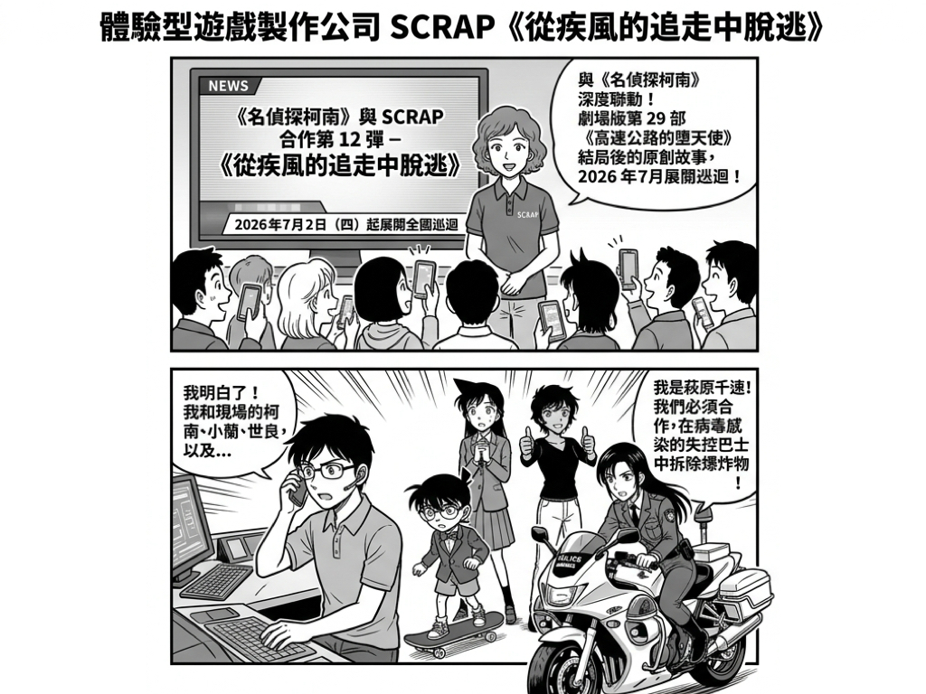 體驗型遊戲製作公司 SCRAP 4月22日宣布,與《名偵探柯南》合作的第 12 彈作品《從疾風的追走中脫逃》於 2026 年 7 月 2 日(四)起展開全國巡迴。本作與目前正在日本熱映、創下紀錄的劇場版第 29 部《高速公路的墮天使》深度聯動,描繪電影結局後發生的全原創故事。
