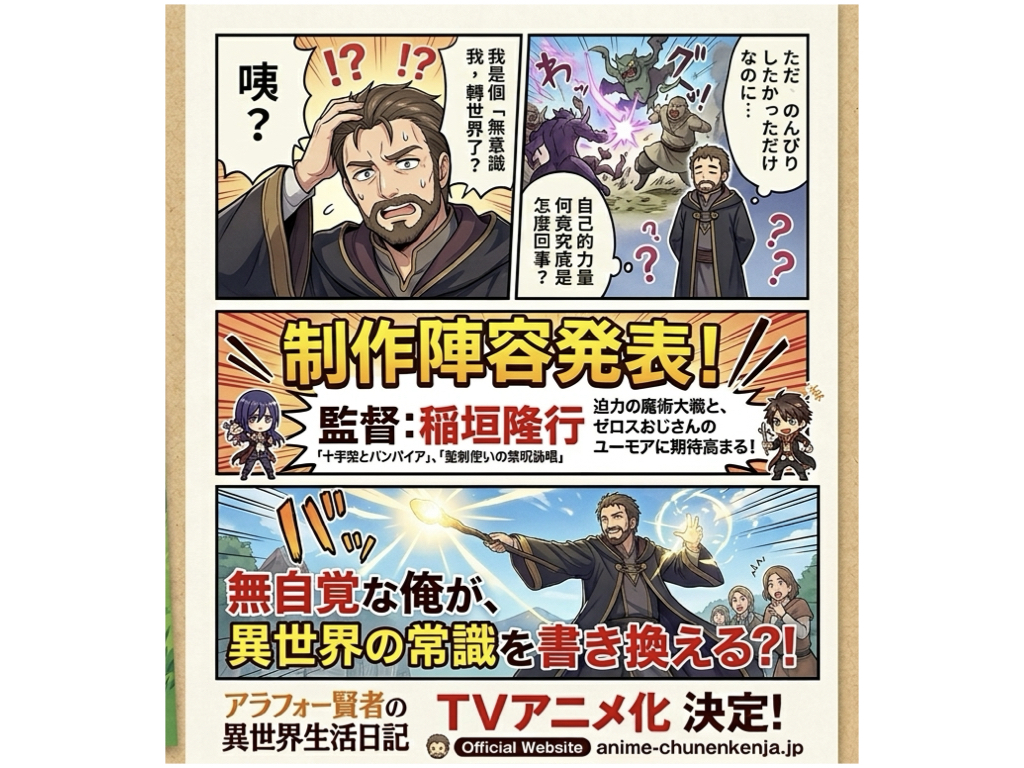 由寿安清所著、西野リュウ負責插畫的人氣輕小說系列《中年賢者的異世界生活日記》(アラフォー賢者の異世界生活日記),今日正式宣布將改編為 TV 動畫。官方同時公開了製作核心陣容,確定由執導過多部知名動作動畫的 稻垣隆行 擔任監督。