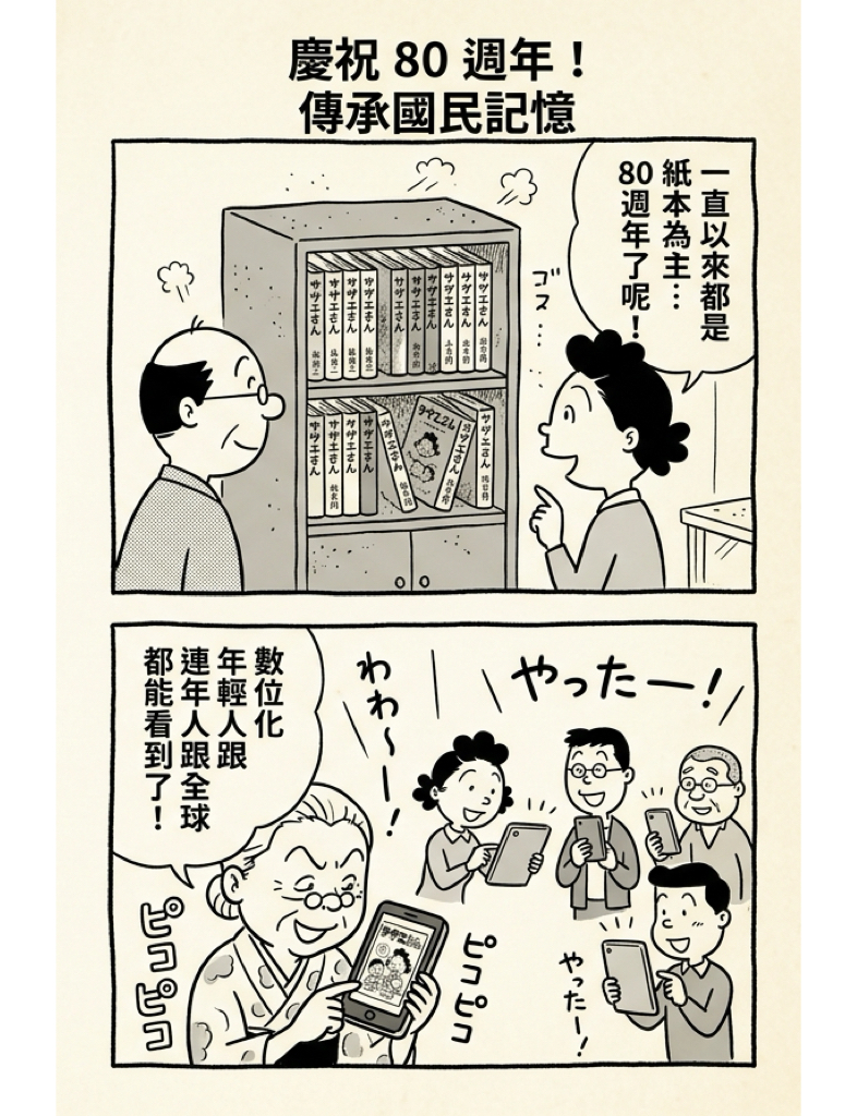 長期以來,長谷川町子的作品堅持以紙本形式傳承,但為了讓年輕一代以及全球讀者能更方便地接觸這部展現日本昭和時代風情的傑作,官方決定與朝日新聞出版合作,將全套作品數位化。