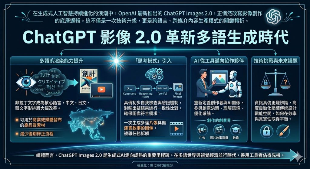 總體而言,ChatGPT Images 2.0 不只是一次產品更新,而是生成式AI走向成熟的重要里程碑。在多語世界與視覺經濟並行的時代,誰能善用這類工具,誰就能在內容競爭中占得先機。