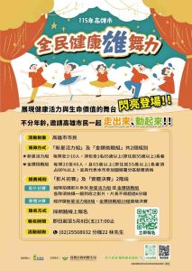 面對超高齡社會的到來,高雄市府近年持續推動多項健康促進政策,延長市民健康餘命,其中衛生局舉辦的「全民健康雄舞力」舞蹈競賽,鼓勵長輩組隊參與深獲好評。今(115)年除延續辦理更將首度開放民眾不限年齡組隊參賽,以多元舞蹈展演形式,達到「全齡參與」與「世代共融」的活動目的,引領市民在律動中找回健康與活力。