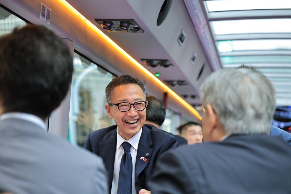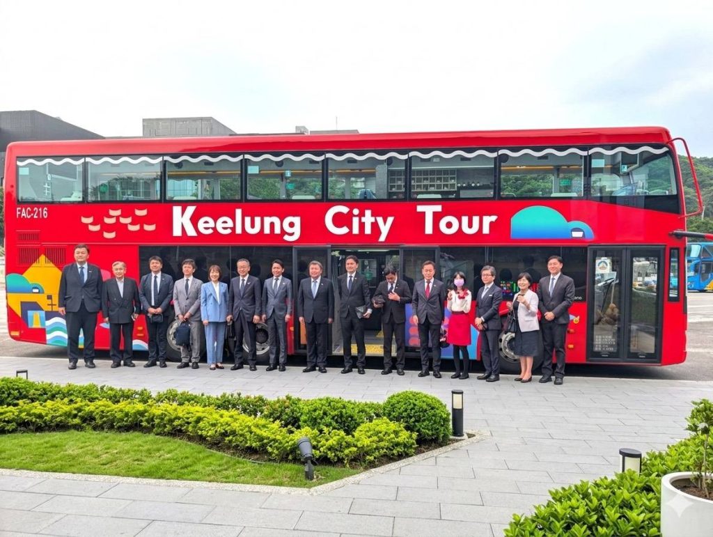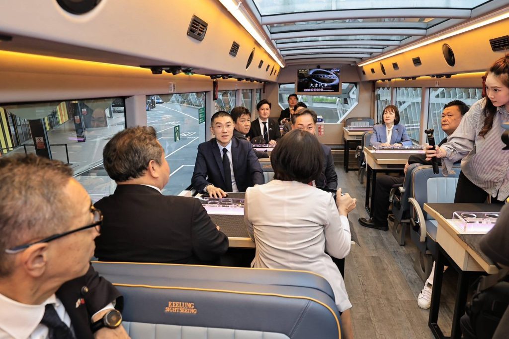 會談結束後,謝市長特別邀請訪團搭乘基隆最新推出的雙層觀光巴士,親自陪同導覽港區及市區景觀。行程沿線山海交織、港市景致開闊,展現基隆獨特的城市風貌。車上笑聲交織、互動熱絡,氣氛輕鬆自然。謝市長也沿途介紹市政建設與觀光發展成果,分享城市轉型願景。訪團成員對於以移動視角體驗基隆表示高度肯定,認為搭乘雙層巴士能夠深度感受城市特色與發展能量。
