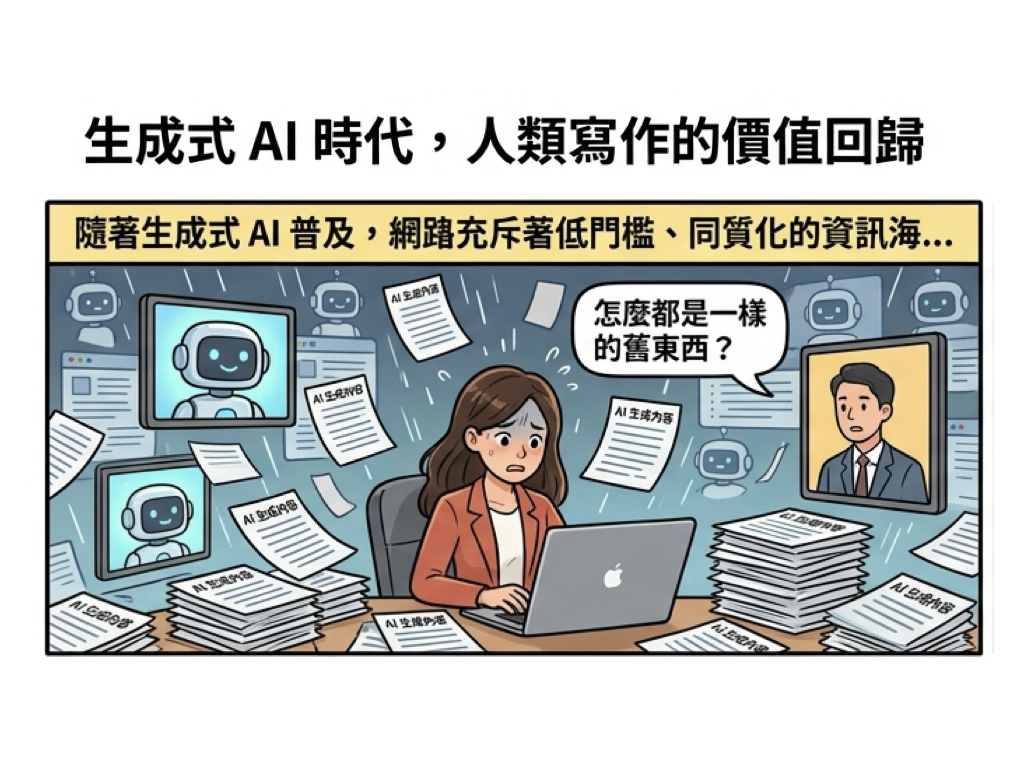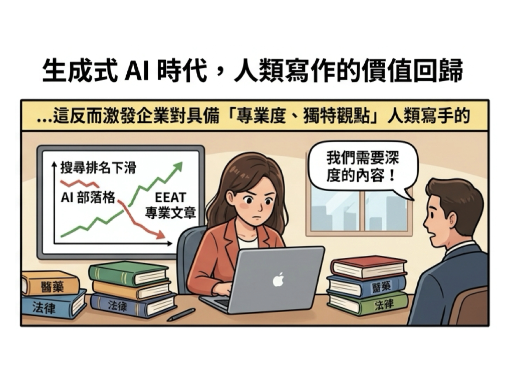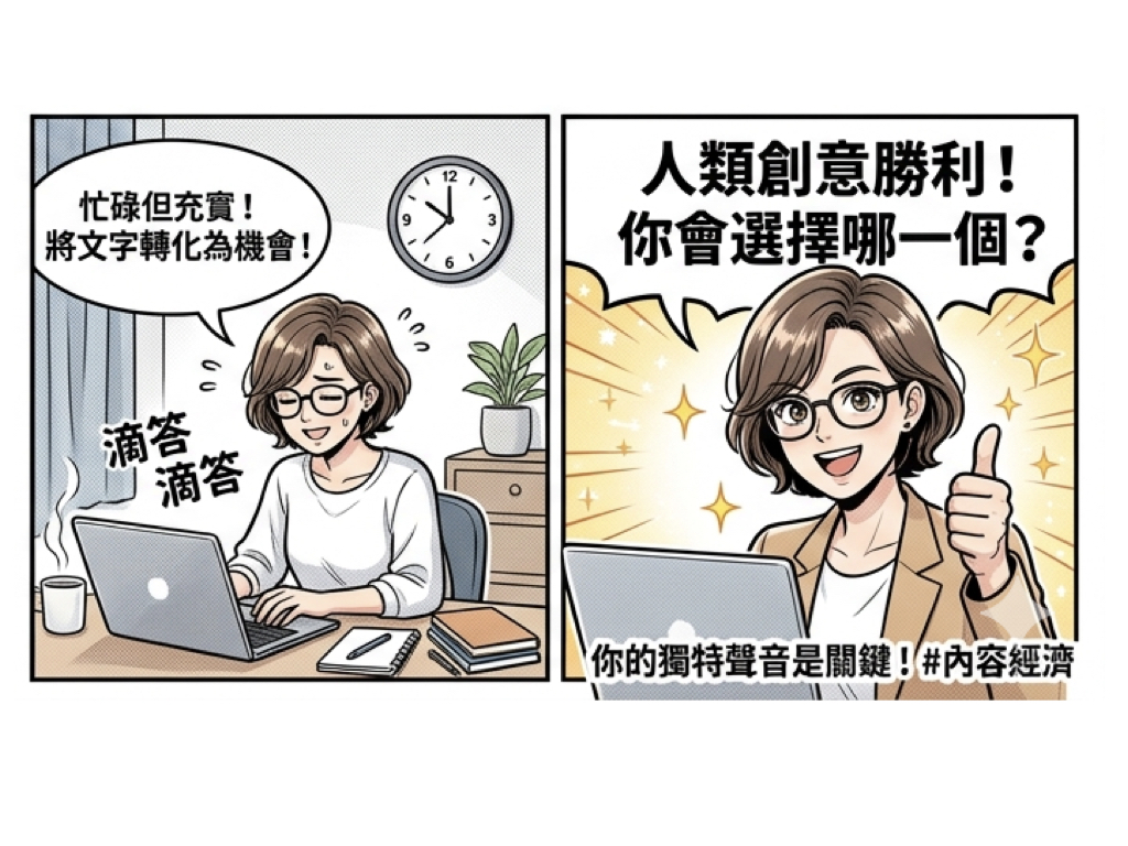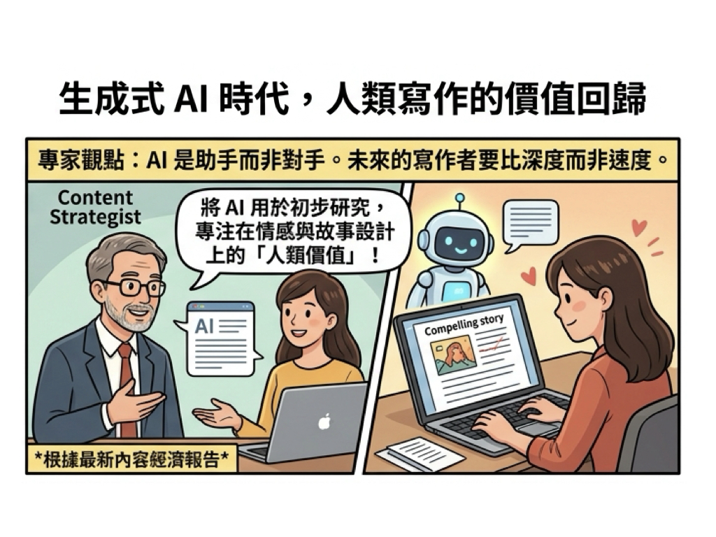 資深內容策略師指出:「未來的寫作者不是要跟 AI 比速度,而是要比深度。」成功的寫手正學會將 AI 用於初步研究與草稿生成,並將更多精力投入在情感連結、故事設計與批判性思考上,這正是目前企業願意支付高薪購買的「人類價值」。