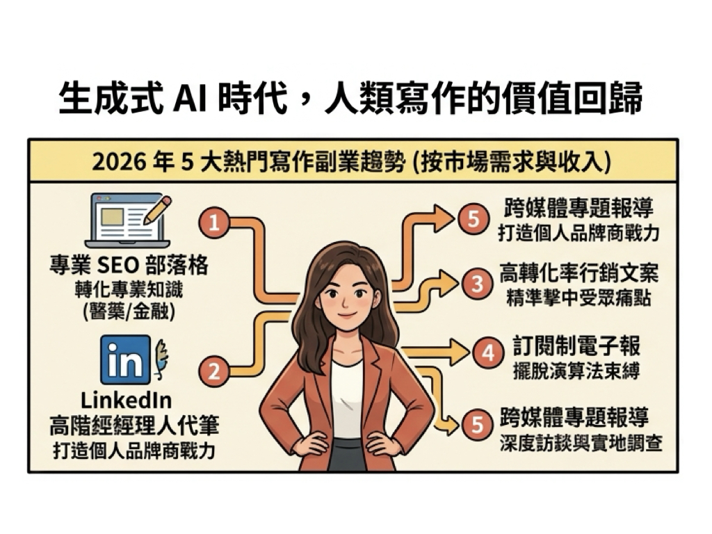 隨著生成式 AI 普及,內容產業正經歷前所未有的變革。然而,市場趨勢顯示,低門檻的 AI 內容導致網路資訊高度同質化,反而激發企業對「高專業度、具獨特觀點」人類寫手的強烈需求。根據最新內容經濟報告顯示,2026 年寫作市場正迎來一波「人類創作」的價值回歸,其中以 5 大寫作副業最受兼職創作者青睞。
