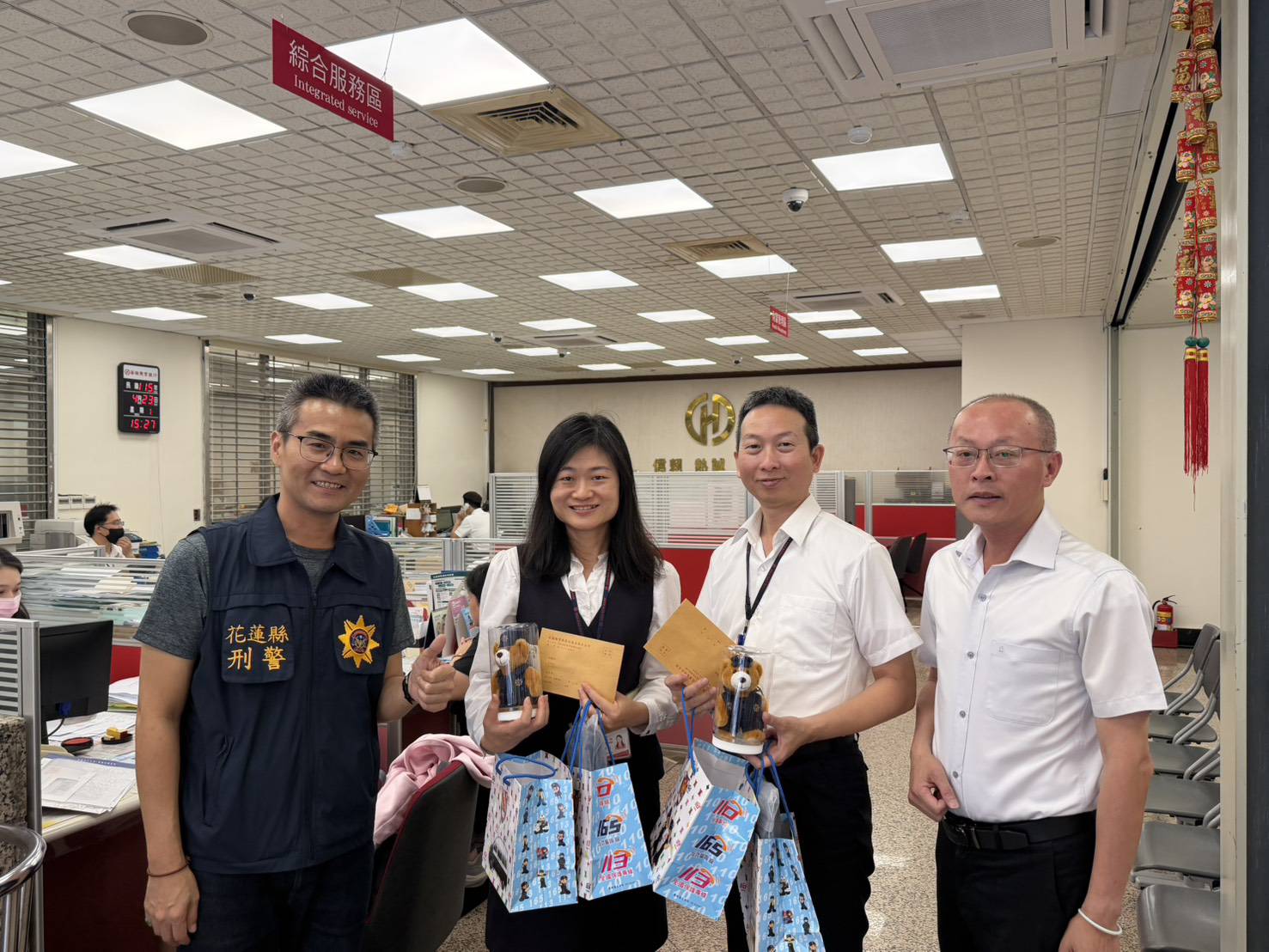 本次慰勉花蓮縣警察局局長范織坤特別致贈禮品背包,以表達對金融機構第一線人員積極防詐之肯定;花蓮警察分局亦致贈警察娃娃及禮券,感謝行員平時配合警方推動反詐騙工作,展現警銀合作之良好成效。