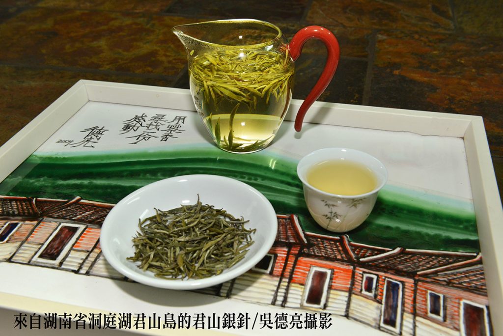 「君山銀針」是中國十大名茶中唯一的黃茶,僅產於湖南省洞庭湖中的君山島,全採剛抽出尚未張開的茶樹嫩芽製作,因而細卷如針而名;也有形如長眉而稱「老君眉」。茶品滿披茸毛,芽頭金黃光亮且肥壯勻齊,茶芽外裹一層白毫,內部呈橙黃色,有「金鑲玉」的美譽。