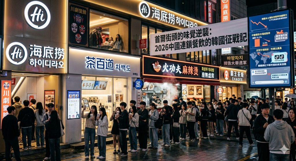 2026年的首爾,夜幕下的弘大商圈霓虹閃爍,一家家掛著中文招牌的餐飲店前排隊人龍蜿蜒。海底撈的川劇變臉表演引來陣陣驚呼,茶百道的手搖杯成為MZ世代IG打卡的標配,而「火功夫」麻辣燙店內更是座無虛席——這幅景象,已成為首爾日常街景的一部分。作者深入分析了為何在韓國經濟環境低迷、本土品牌紛紛倒閉的當下,中國連鎖品牌(如海底撈、火功夫、茶百道等)卻能反其道而行,在韓國各大商圈(如弘大、建大)強勢插旗。 根據韓國公平交易委員會最新統計,過去四年本土餐飲加盟店的倒閉率持續攀升,然而中國品牌卻像在舉辦一場熱鬧的派對——從江南區一路拓展到年輕人聚集的商圈,除了已站穩腳步的火鍋與麻辣燙,霸王茶姬、茶百道等茶飲品牌更預告大舉進軍。