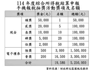 北區國稅局表示,手機報稅抽獎活動預訂於115年8月中旬抽出19,586位獲獎幸運兒,活動獎項包括現金和電子禮券兩大項,現金獎項:頭獎1名、獎金50,000,貳獎5名、獎金每名20,000,叁獎10名、獎金每名10,000,肆獎20名、獎金每名5,000,伍獎50名、獎金每名2,000;電子禮券獎項:陸獎3,000名、獎金500,普獎16,500名、獎金每名200。