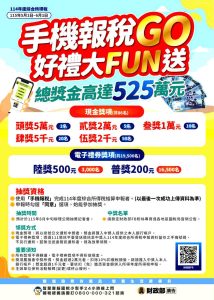 為鼓勵納稅義務人使用手機完成114年度綜合所得稅結算申報,財政部特別舉辦「手機報稅GO.好禮大FUN送」全國性抽獎活動,總獎額高達新臺幣(下同)525萬元。財政部北區國稅局今(4.24)日舉行「114年度所得稅結算申報宣導記者座談會」中指出,納稅義務人於114年度綜合所得稅結算申報期間(即115年5月1日至115年6月1日),只要使用手機報稅並勾選「同意」參加抽獎,就有機會抱回豐富獎金,最高獎額現金5萬元!