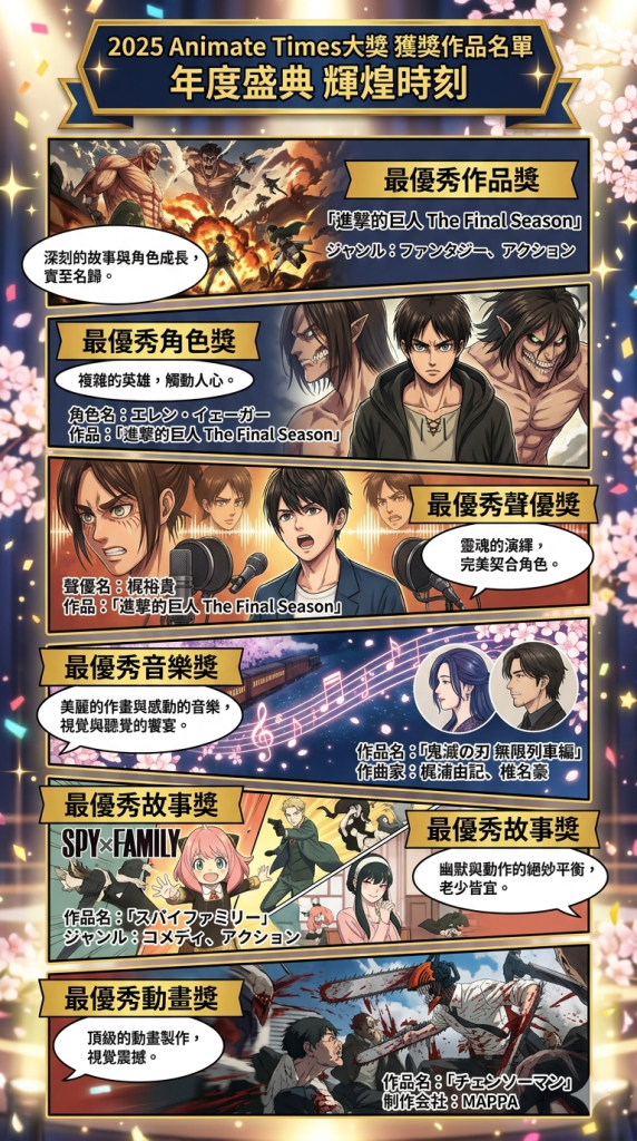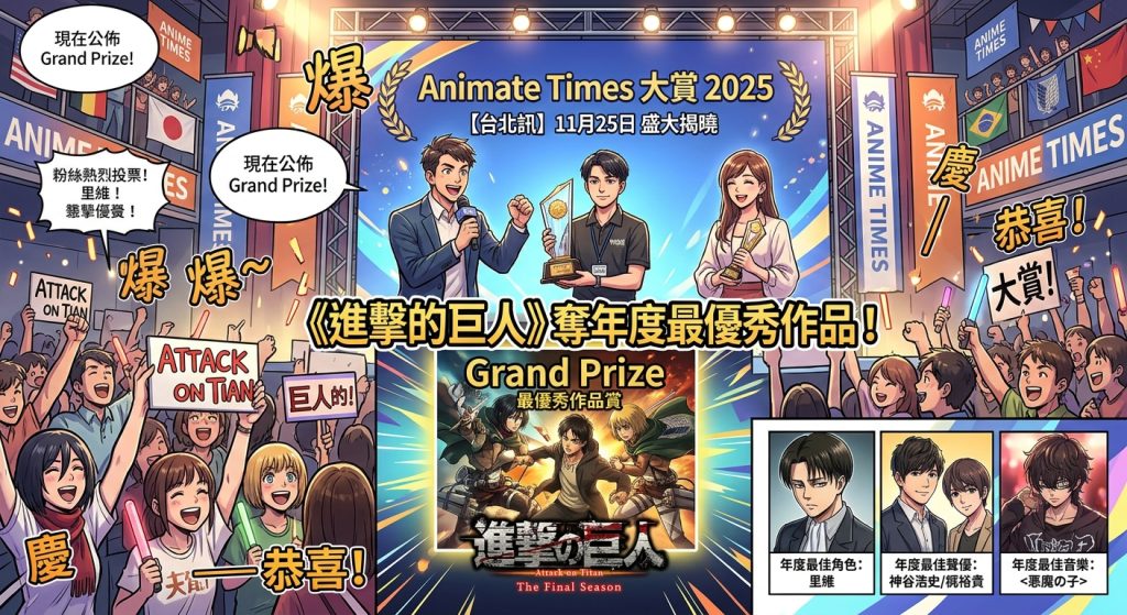 知名動漫媒體 animate Times 於今(25)日正式公開了備受動漫迷矚目的「Animate Times 大賞 2025」最終獲獎名單。本次評選集結了無數粉絲的真實票選與熱烈反響,針對過去一年中表現極其卓越的作品、角色、聲優及動畫音樂進行了嚴格評選。