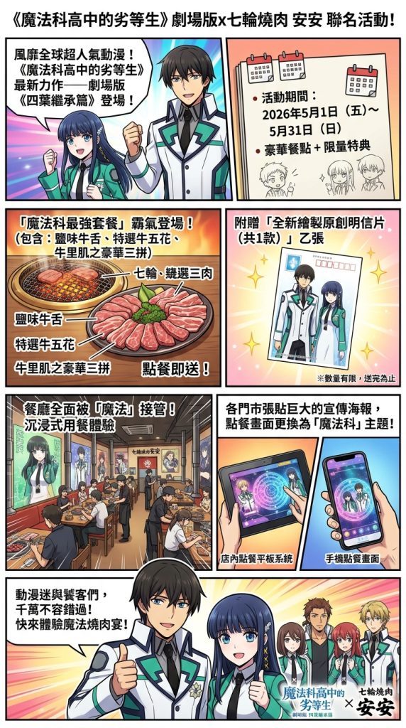 除了專屬套餐與限量特典外,「七輪燒肉 安安」店內也將被濃濃的《魔法科高中的劣等生》氛圍所包圍。活動期間,各門市將張貼巨大的聯名宣傳海報,且店內的點餐平板系統、手機點餐畫面也將全面更換為「魔法科」主題限定介面,讓粉絲在享用美食的同時,彷彿置身於魔法科的世界觀中。