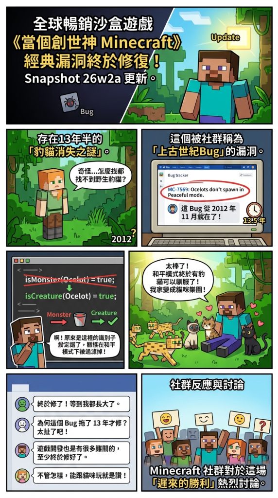 全球暢銷沙盒遊戲《當個創世神 Minecraft》在最新的測試版本(Snapshot 26w2a)中,正式修復了一個在遊戲中存在長達約 13 年半的經典漏洞。該漏洞導致玩家在「和平模式」下無法自然生成野生豹貓。這項修復不僅讓喜愛貓咪的玩家感到振奮,也引發了社群對於「為何這個Bug拖了13年才修」的熱烈討論。