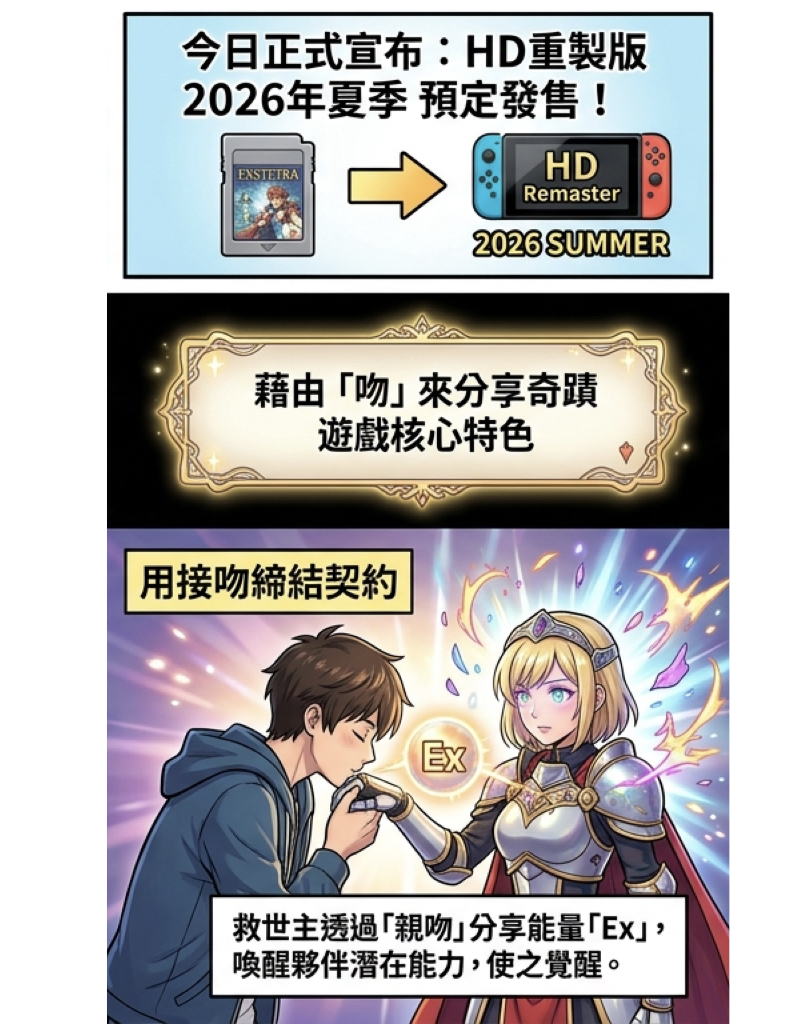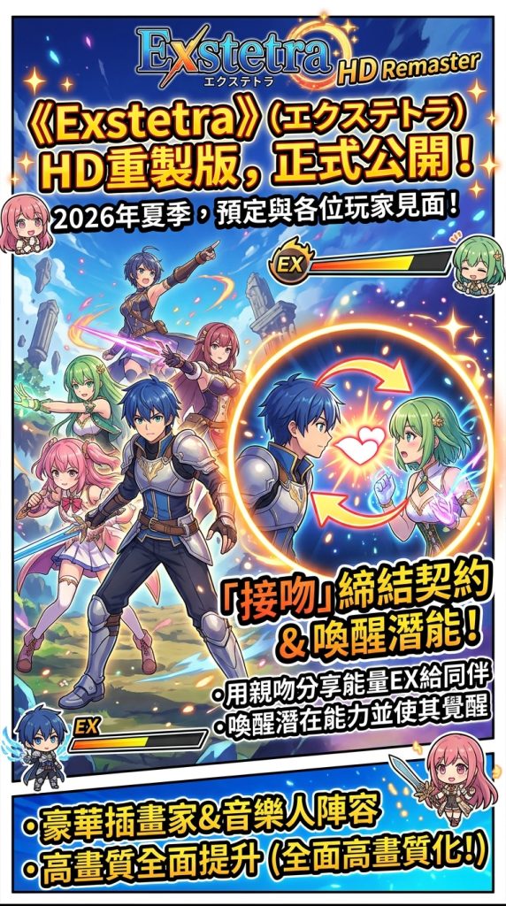 曾經在掌機平台引發熱烈討論的獨特奇幻角色扮演遊戲《Exstetra》(エクステトラ),於今(25)日正式宣布將推出HD重製版,並預定於 2026年夏季 與各位玩家見面!這款以「接吻」為核心系統的異世界救世冒險譚,以更精美的畫質與優化的系統重獲新生。