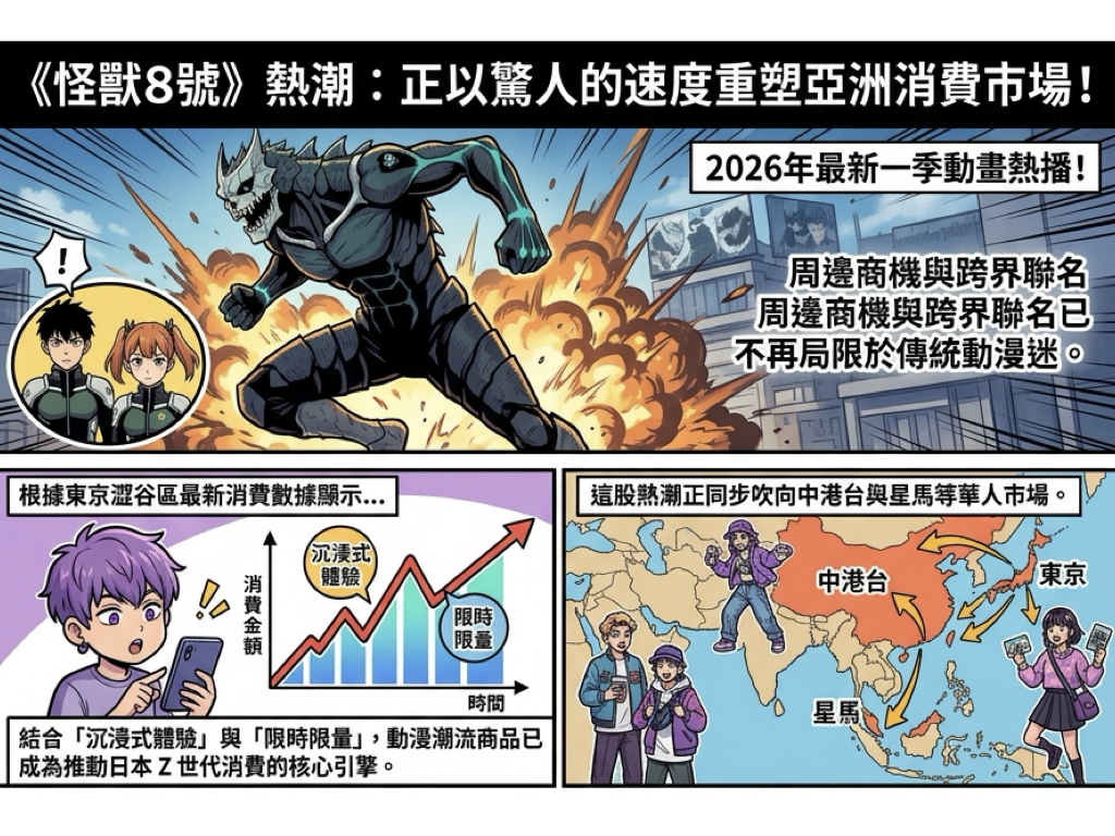 日本動漫正以驚人的速度重塑亞洲消費市場!2026年隨著《怪獸8號》最新一季動畫熱播,周邊商機與跨界聯名已不再局限於傳統動漫迷。根據東京澀谷區最新消費數據顯示,結合「沉浸式體驗」與「限時限量」的動漫潮流商品,已成為推動日本 Z 世代消費的核心引擎,這股熱潮正同步吹向中港台與星馬等華人市場。