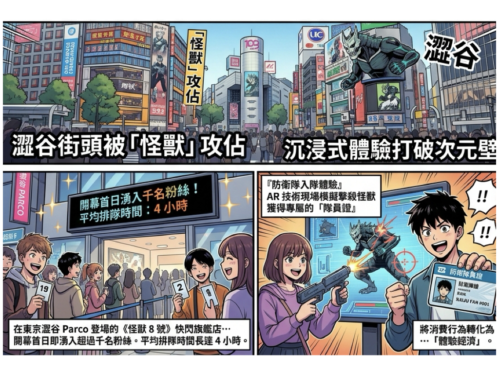 在東京澀谷 Parco 登場的《怪獸8號》快閃旗艦店,開幕首日即湧入超過千名粉絲,平均排隊時間長達 4 小時。與以往單純販售公關周邊不同,本次活動主打「防衛隊入隊體驗」,消費者可透過 AR 技術現場模擬擊殺怪獸,並獲得專屬的「隊員證」,將消費行為直接轉化為高度具備社群炫耀價值的「體驗經濟」。