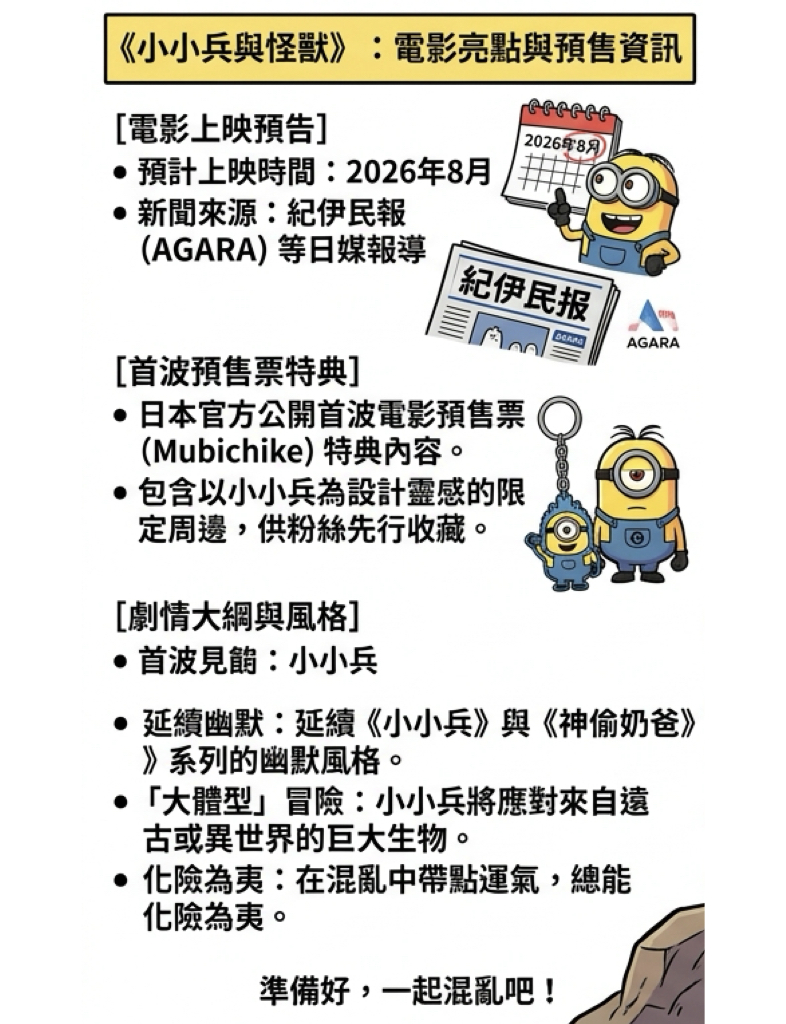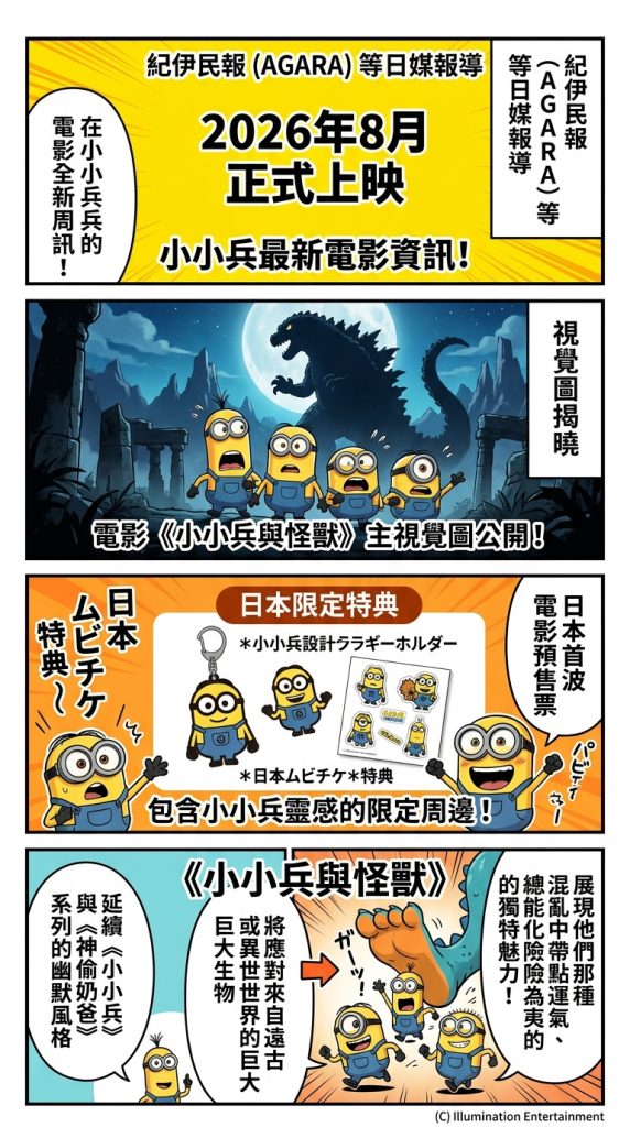 根據 紀伊民報 (AGARA) 等日媒報導,這部備受期待的新作預計於 2026年8月 正式上映。除了視覺圖揭曉外,官方也同步公開了日本首波電影預售票(Mubichike)的特典內容,包含以小小兵為設計靈感的限定周邊,讓廣大粉絲能在電影開映前先行收藏。