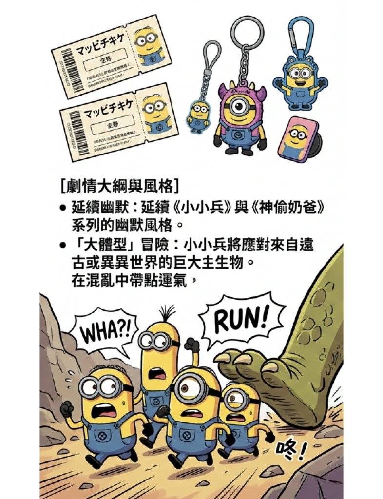 延續《小小兵》與《神偷奶爸》系列的幽默風格,《小小兵與怪獸》將帶領觀眾進入一場前所未有的「大體型」冒險。電影將深入探索小小兵們如何應對來自遠古或異世界的巨大生物,並再次展現他們那種混亂中帶點運氣、總能化險為夷的獨特魅力。