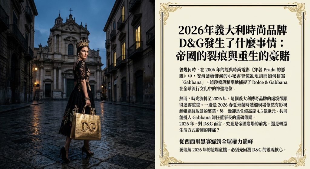 曾幾何時,在 2006 年的經典時尚電影《穿著 Prada 的惡魔》中,安海瑟薇飾演的小秘書曾慌亂地詢問如何拼寫「Gabbana」。這段橋段精準地捕捉了 Dolce & Gabbana 在全球流行文化中的神聖地位。然而,時光流轉至 2026 年,這個義大利傳奇品牌的處境卻顯得迷霧重重。一邊是 2026 春夏米蘭時裝週現場依然有影視劇組進駐取景的繁華,另一邊卻是負債高達 4.5 億歐元、共同創辦人 Gabbana 卸任董事長的重磅傳聞。2026 年,對 D&G 而言,究竟是帝國崩塌的前兆,還是轉型生活方式帝國的陣痛?