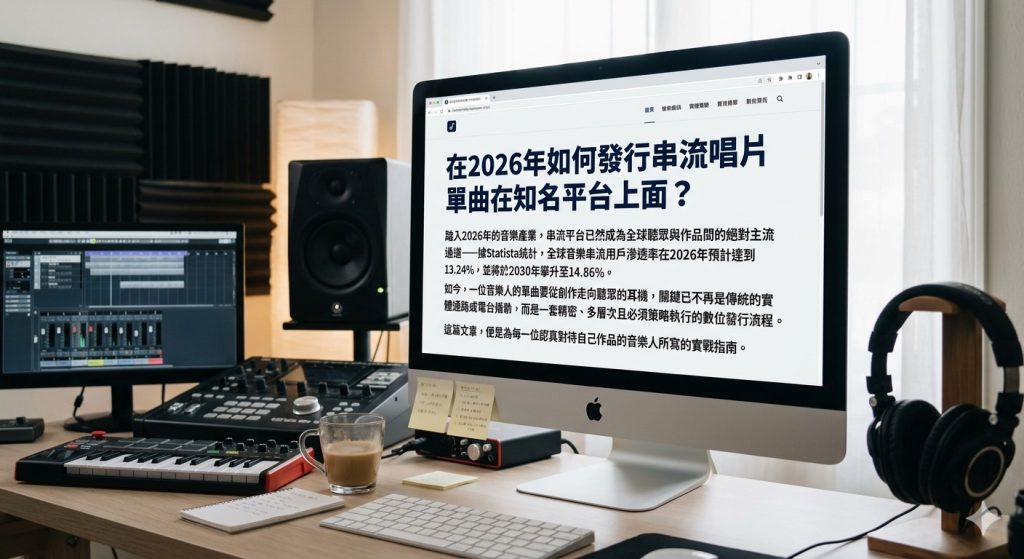 踏入2026年的音樂產業,串流平台已然成為全球聽眾與作品間的絕對主流通道——據Statista統計,全球音樂串流用戶滲透率在2026年預計達到13.24%,並將於2030年攀升至14.86%。如今,一位音樂人的單曲要從創作走向聽眾的耳機,關鍵已不再是傳統的實體通路或電台播歌,而是一套精密、多層次且必須策略執行的數位發行流程。這篇文章,便是為每一位認真對待自己作品的音樂人所寫的實戰指南。