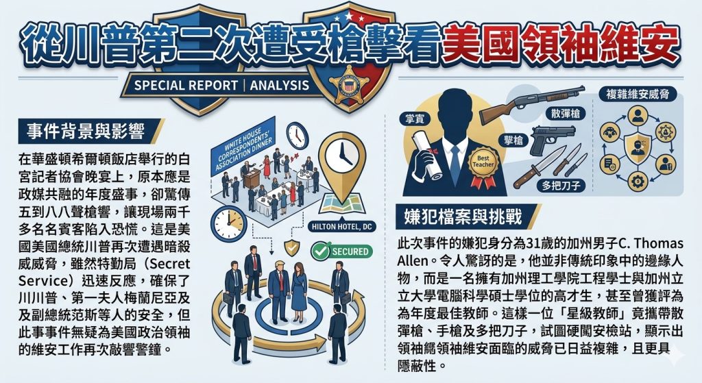 在華盛頓希爾頓飯店舉行的白宮記者協會晚宴上,原本應是政媒共融的年度盛事,卻驚傳五到八聲槍響,讓現場兩千多名賓客陷入恐慌。這是美國總統川普再次遭遇暗殺威脅,雖然特勤局(Secret Service)迅速反應,確保了川普、第一夫人梅蘭尼亞及副總統范斯等人的安全,但此事件無疑為美國政治領袖的維安工作再次敲響警鐘。