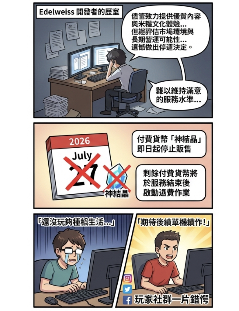 這款主打結合「種稻模擬」與「橫向捲軸動作」要素的作品,自上市以來便受到廣大玩家與原作粉絲的高度關注。然而,官方在公告中坦言,儘管團隊致力於提供最優質的遊戲內容與獨特的米糧文化體驗,但在評估目前的市場環境及後續長期營運的可能性後,認為難以繼續維持能讓玩家滿意的服務水準,因此遺憾地做出停運決定。