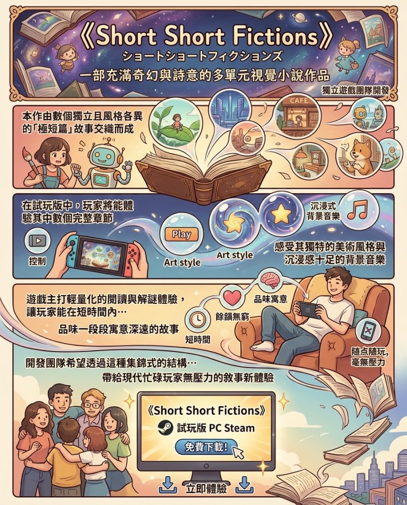 由獨立遊戲團隊開發的集錦式冒險遊戲《Short Short Fictions(ショートショートフィクションズ)》,今(27)日正式於 PC Steam 平台推出免費試玩版,邀請玩家搶先體驗這部充滿奇幻與詩意的多單元視覺小說作品。