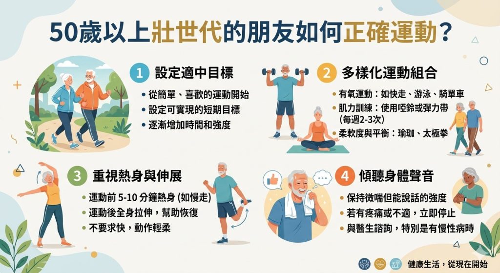 對於50至70歲的朋友,正確運動的核心原則是「穩定上求活動」。不要急著追求強度或重量,先檢視自己的呼吸是否深長、核心能否在動態中維持穩定。若有腰椎、膝蓋等問題,建議尋求具備矯正訓練專業的教練或醫師評估,從減壓與本體感覺訓練開始,逐步解鎖被年齡封印的活動度。