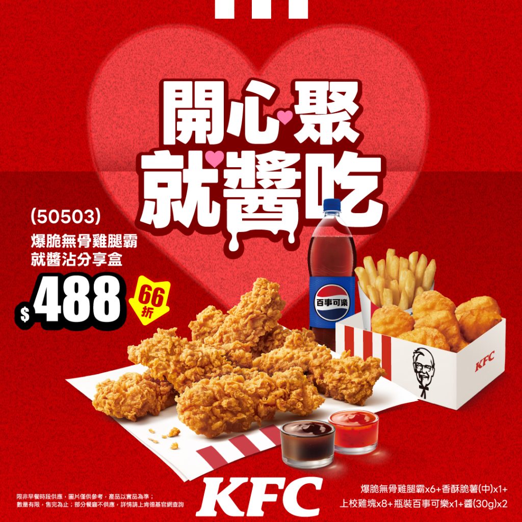 除了經典組合,肯德基更推陳出新,讓吃炸雞變得更有趣!「爆脆無骨雞腿霸就醬沾分享盒」內含 6 塊爆脆無骨雞腿霸、1 份中薯、8 塊上校雞塊、1 瓶 1.25L 可樂,以及特製「南洋酸甜醬」與 「BBQ 煙燻醬」,原價 $743,活動期間(4/28-5/18)66折優惠,有感省下 $255,只需 $488直接開趴。酥脆多汁的無骨雞腿霸,採用不辣配方搭配豐富配餐與不同沾醬變換口味,每一口都酥香多汁,帶來滿滿幸福感。大塊全無骨的雞腿肉,入口輕鬆不費力,方便拿、好享用,大人小孩都能安心大口吃。無論是想給媽媽一個驚喜,還是想和好友共享美味時光,都是歡聚的絕對首選。