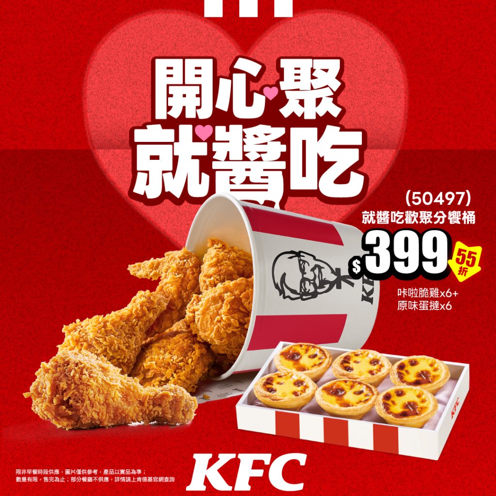 就醬吃歡聚分享桶 咔啦脆雞x6 + 原味蛋撻x6 55% $399 $720 4/28-5/11