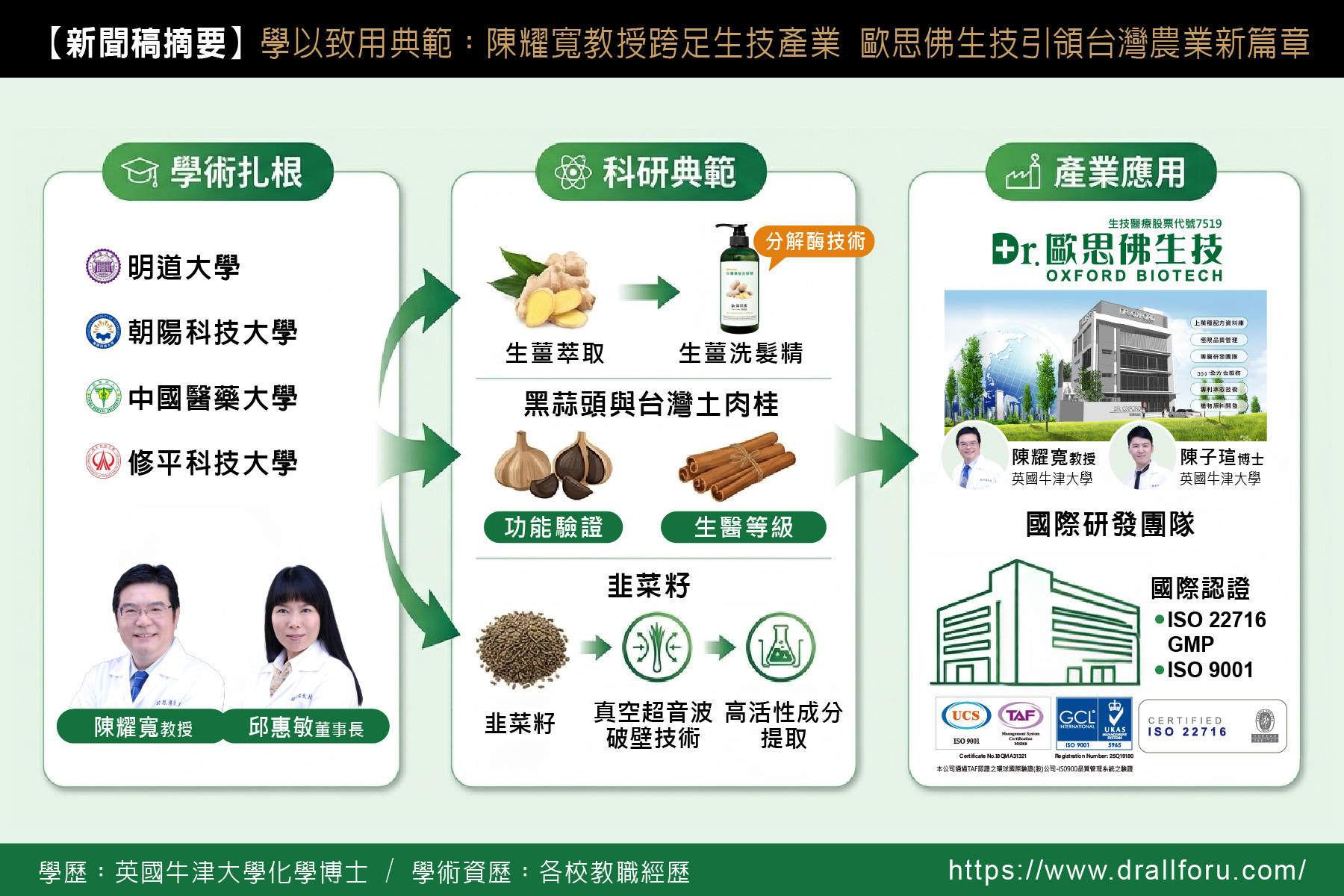英國牛津大學化學博士陳耀寬教授,曾任教中國醫藥大學、朝陽科技大學、修平科技大學及明道大學承正講座教授,擁有深厚學術背景與25年教學研究經驗。如今他以歐思佛生物科技股份有限公司(股票代號7519)創辦人身份,成功將實驗室研發能量轉化為民生應用,開創台灣農業生技新篇章。陳教授長期投入產學合作,深入農村運用生技技術,為台灣本土農產品如生薑、台灣土肉桂、黑蒜頭及韭菜籽等,找到高附加價值轉型之路,讓傳統農產搖身一變成為守護民眾健康的生技精品。