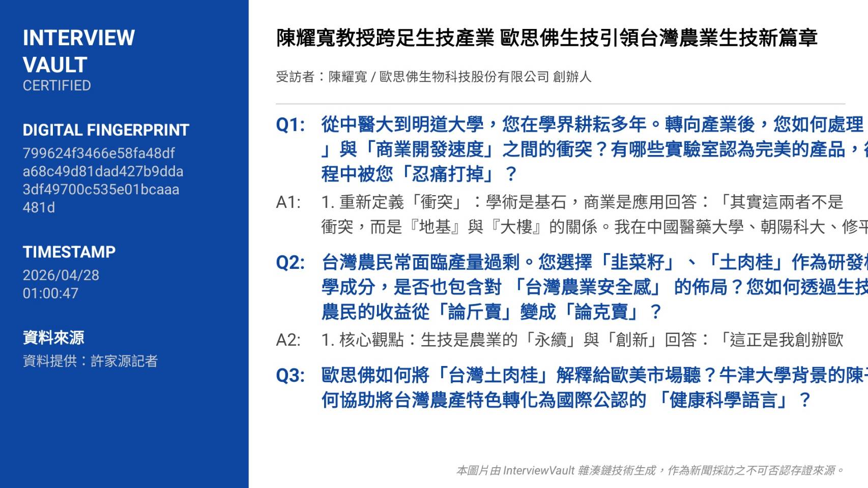歐思佛生技核心研發團隊由陳耀寬教授領軍,結合其子陳子瑄博士(英國牛津大學高級研究員,公共衛生與醫學背景)的國際視野,共同接軌全球標準。公司已取得ISO 22716化妝品GMP、ISO 9001及英國UKAS等多項國際認證,秉持「ALLFORU(為您用心)」及「綠色、美麗、健康」理念,致力將台灣優質農產轉化為安全、天然的保養品與保健食品。董事長邱惠敏強調,無論科技如何進步,最終仍需以消費者安全與實際效果為優先。民眾選購相關產品時,建議選擇具國際認證的合格廠商,並依個人體質使用,效果因人而異,必要時請諮詢專業醫師或營養師。