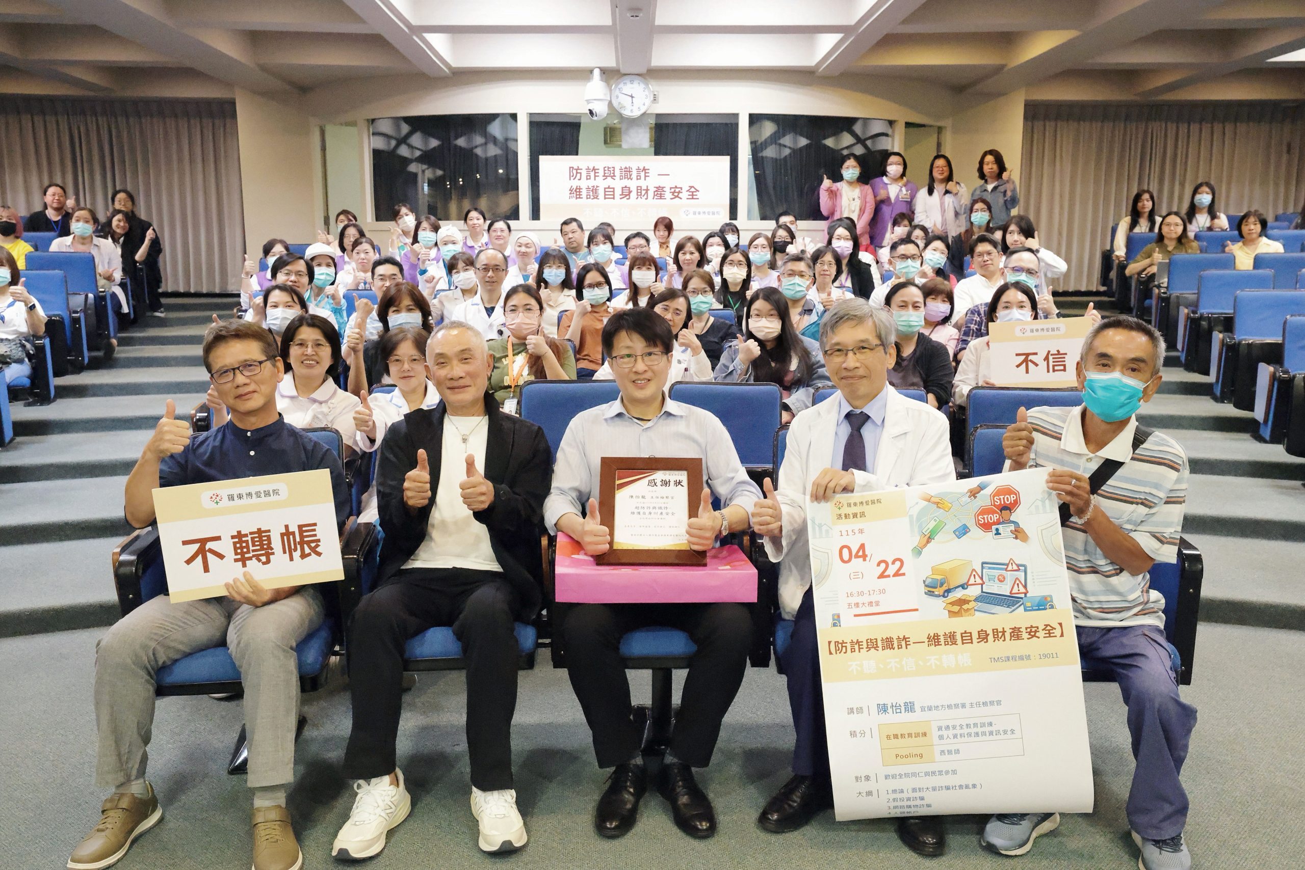 4月22日,羅東博愛醫院舉辦「防詐騙意識提升與應對策略課程」,特別邀請宜蘭地方檢察署陳怡龍主任檢察官授課,內容涵蓋常見假檢警、假投資、釣魚連結等詐騙手法,並開放民眾免費報名參與。課程中醫護人員手持標語齊喊「不聽、不信、不轉帳」口號,展現防詐決心。陳怡龍檢察官提醒,接獲自稱檢警或要求操作金流的來電,務必先掛電話再查證,可撥打165反詐騙專線求助。