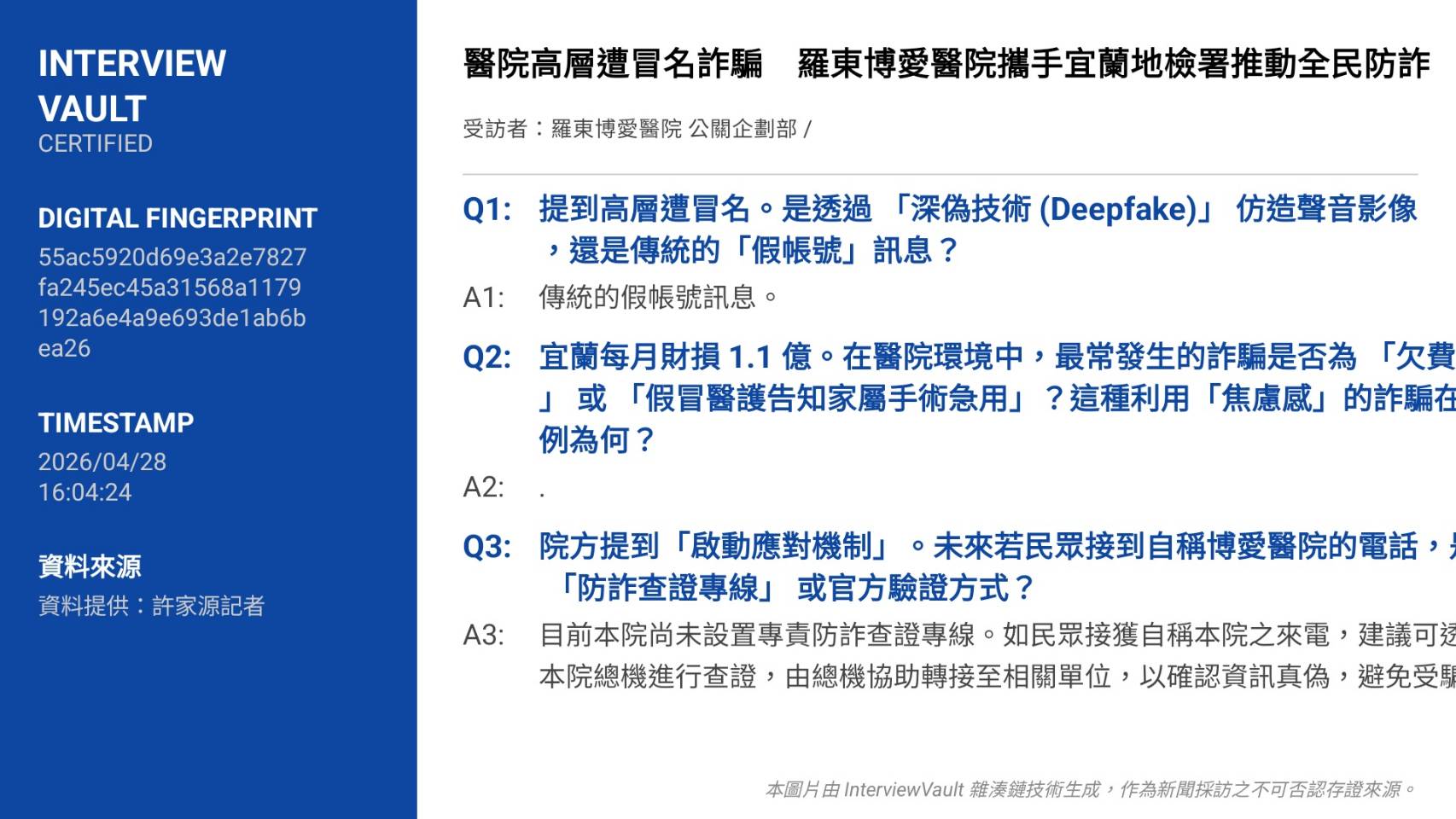 羅東博愛醫院近日發生院方高層遭不明人士冒名詐騙事件,院方第一時間澄清並啟動內部管控,同時將此事件轉化為防詐教育契機。宜蘭縣平均每月詐騙案件約247件,財損高達1.1億元,顯示詐騙風險已成地方治安隱憂。醫院決定從醫療場域出發,積極投入防詐宣導,希望提升院內同仁與社區民眾的識詐能力。
