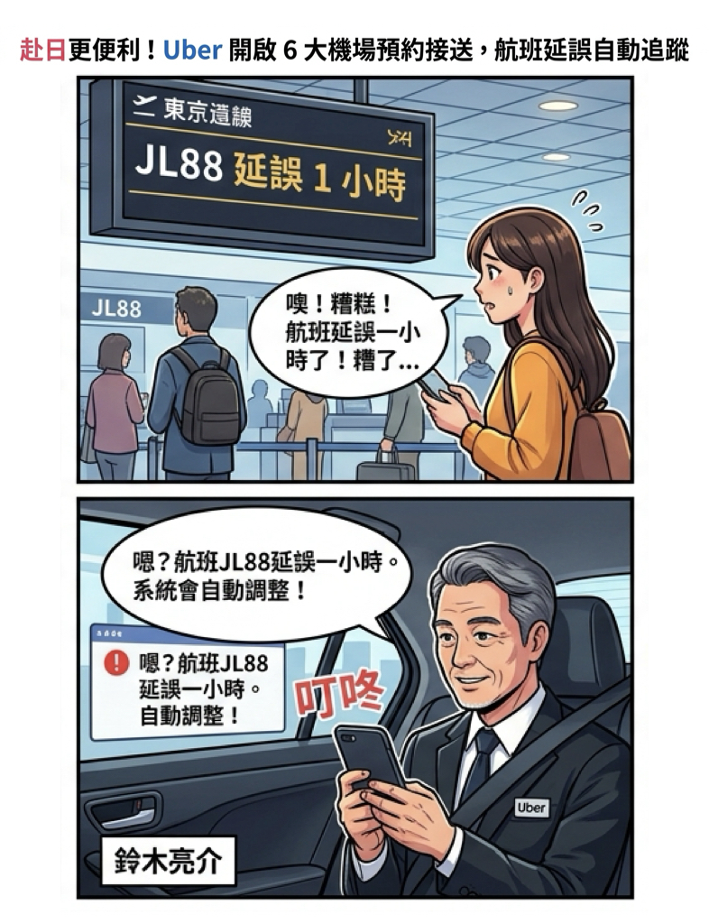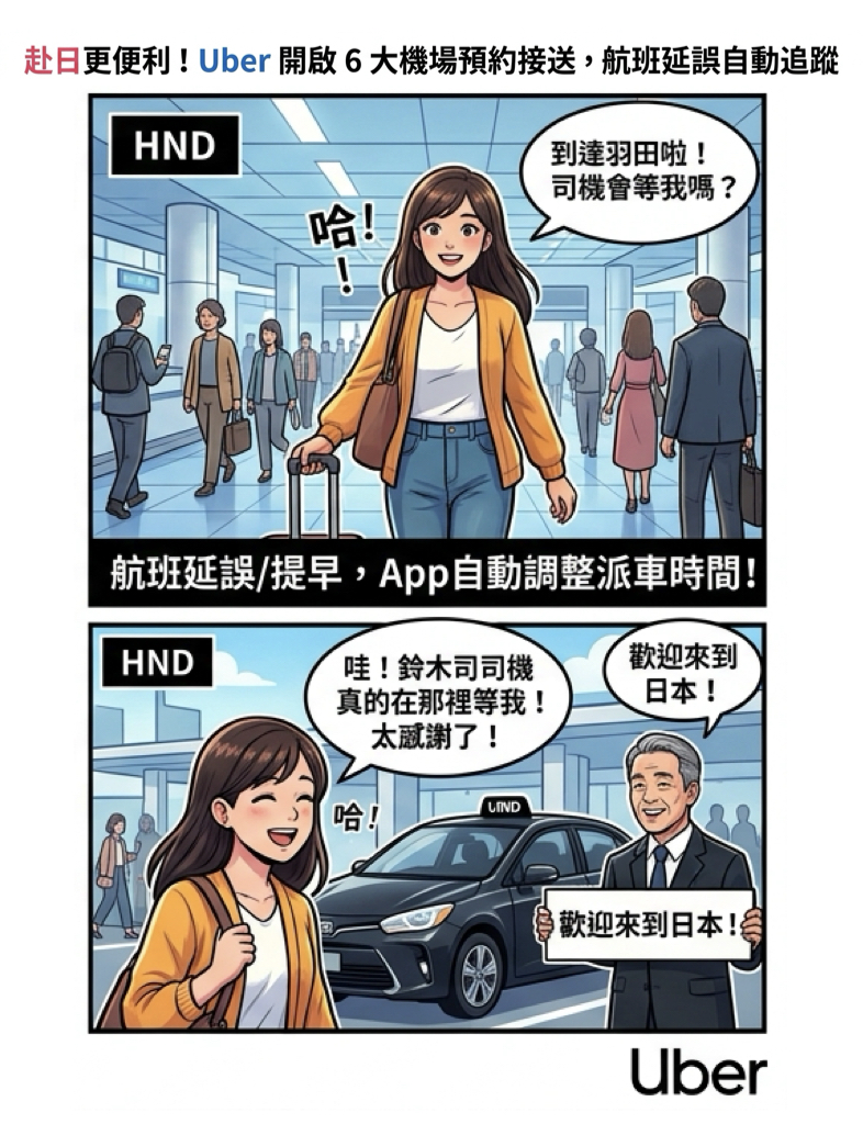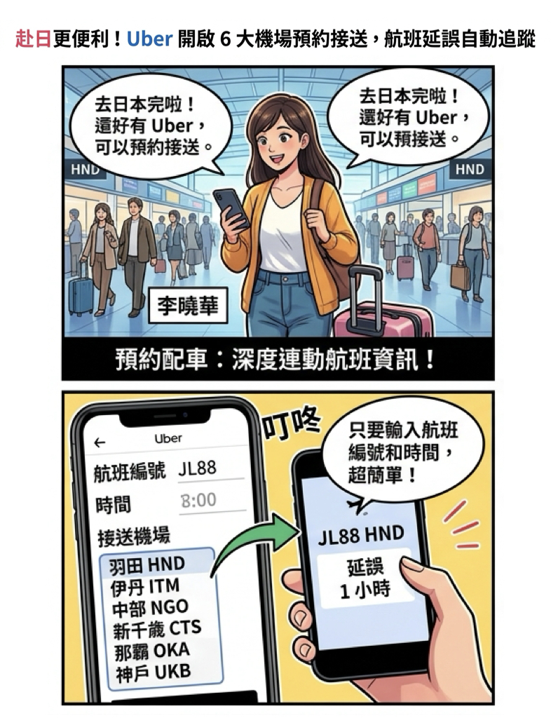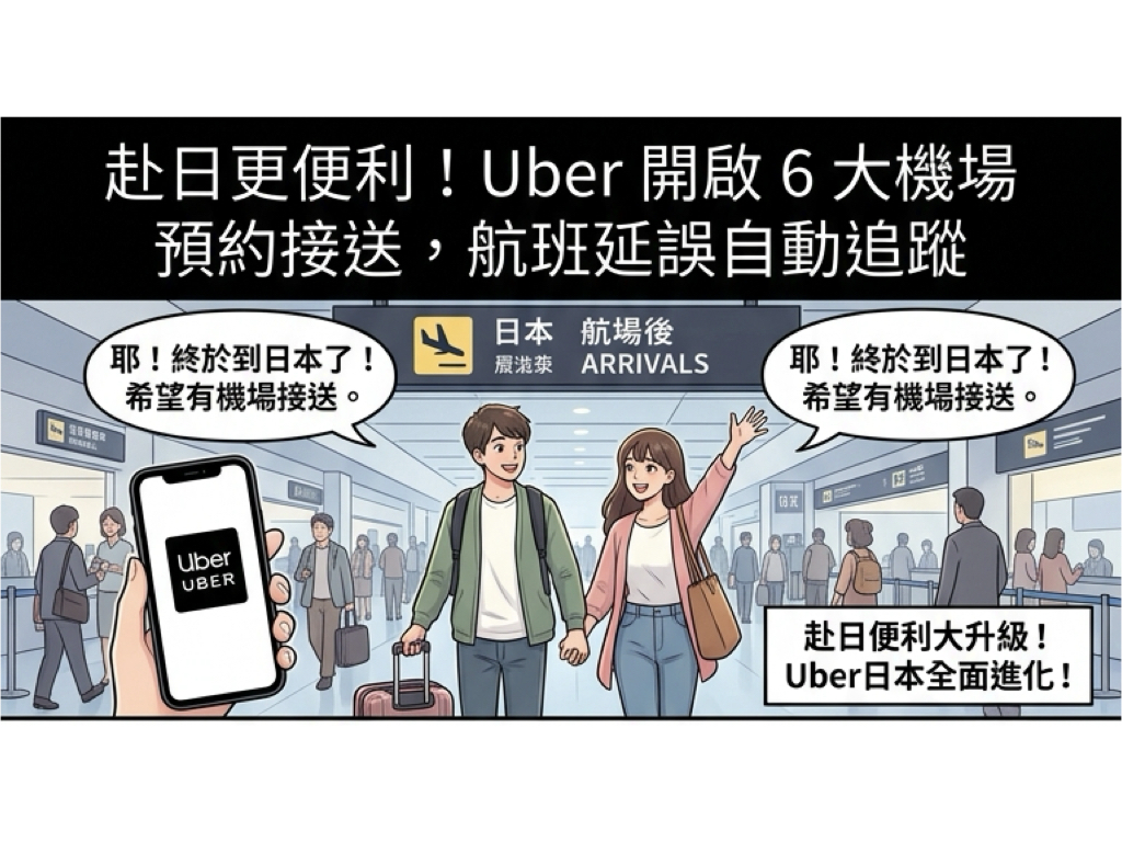 Uber Japan 宣布於日本六大主要機場(羽田、伊丹、中部、新千歲、那霸、神戶)推出全新「預約配車」功能。此項已在國外行之有年的服務,正式導入日本市場,核心亮點在於系統與航班資訊深度連動。旅客僅需在 App 預約時輸入航班編號與搭車時間,系統便會自動擷取實際起降數據;即使遭遇航班延誤或提早抵達,App 也會自動調整派車時間,確保司機在最完美的時刻準時迎賓。
