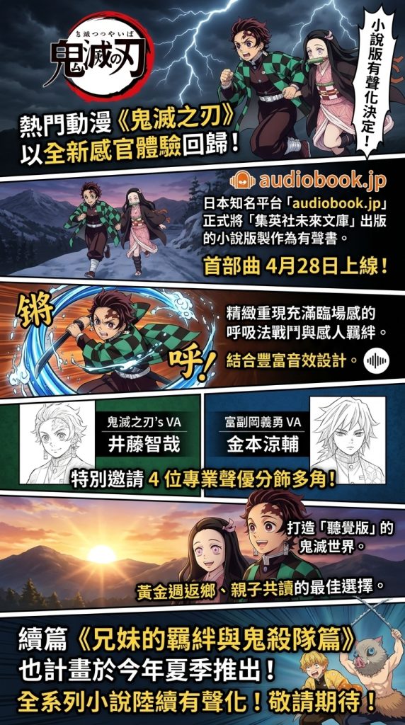 熱門動漫《鬼滅之刃》將以全新感官體驗回歸!日本知名平台「audiobook.jp」宣布,正式將「集英社未來文庫」出版的小說版製作為有聲書,首部曲《炭治郎與禰豆子、命運的開始篇》於 2026 年 4 月 28 日正式上線。本次特別邀請井藤智哉、金本涼輔等 4 位專業聲優分飾多角,結合豐富的音效設計,精緻重現充滿臨場感的呼吸法戰鬥與感人羈絆,打造「聽覺版」的鬼滅世界。