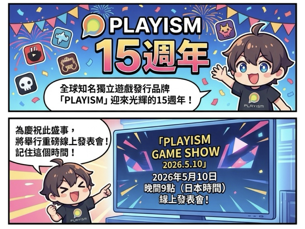全球知名的獨立遊戲發行品牌「PLAYISM」宣布,為慶祝營運屆滿 15 週年,將於 2026 年 5 月 10 日晚間 9 點(日本時間)舉行線上發表會「PLAYISM GAME SHOW 2026.5.10」。這場僅約 15 分鐘的精悍直播,將一口氣公開 11 款遊戲的最新動態,其中更包含多部首度亮相的未公開作品。