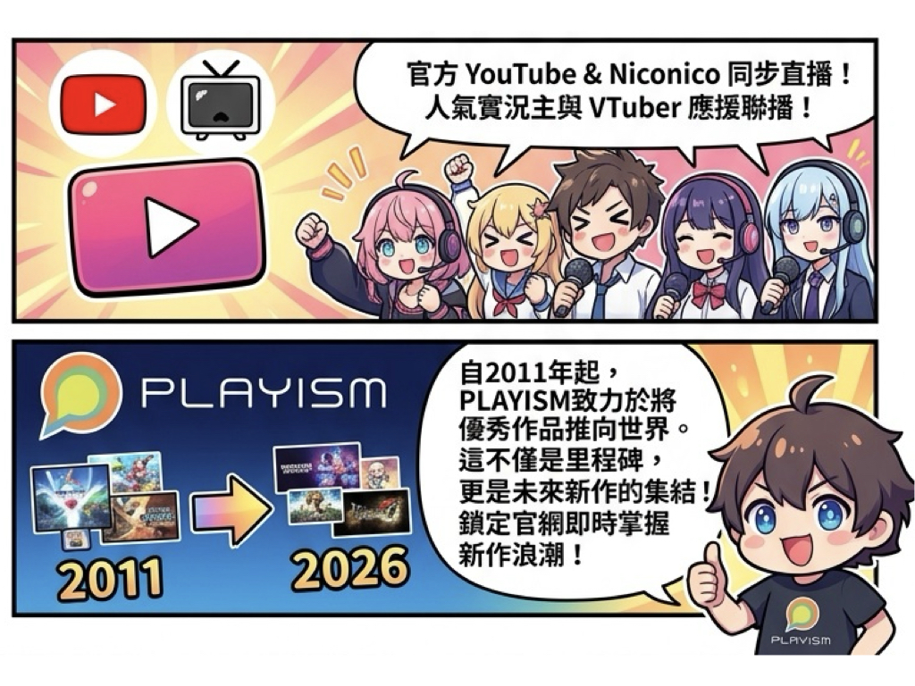 本次活動將透過官方 YouTube 與 Niconico 同步直播,並邀請多位人氣遊戲實況主與 VTuber 進行應援聯播。自 2011 年成立以來,PLAYISM 致力於將各國優秀作品推向世界,本次週年盛典不僅是里程碑的總結,更是未來新作的集結。無論是資深玩家或熱愛獨立創意的觀眾,請務必鎖定官網即時掌握這波強勢新作浪潮!