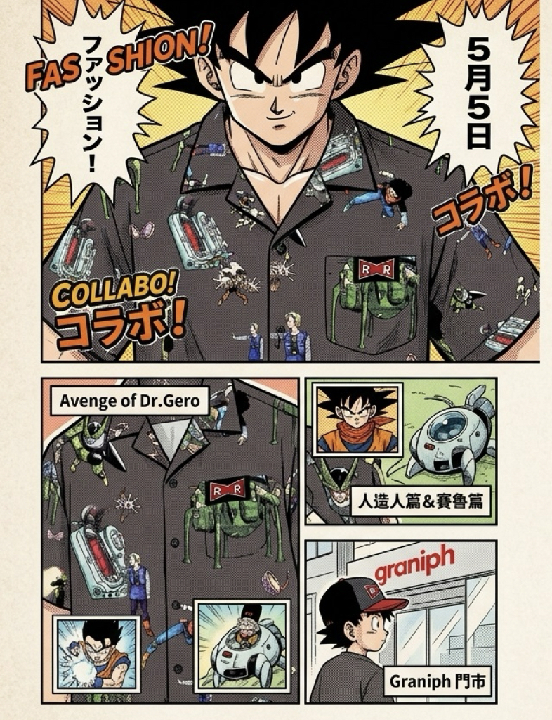 經典動漫《七龍珠 Z》再度與人氣服飾品牌「Graniph」攜手,於 5 月 5 日推出全新聯名系列。本次設計深度致敬「人造人篇」與「賽魯篇」,其中「蓋洛博士的復仇」系列最受矚目,將人造人 16 至 20 號、賽魯以及時光機元素融入寬版襯衫;而刻劃賽魯終戰名場面的「親子龜派氣功」T 恤,更生動再現悟飯與悟空共同奮戰的熱血瞬間。