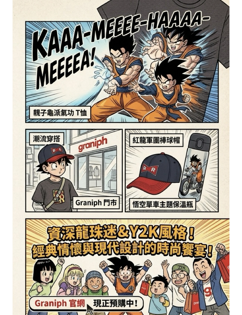 本次聯名新品將以日本國內實體門市及官方線上商店為主要銷售據點。除了多款潮流服飾,還包含紅龍軍團棒球帽與悟空單車主題保溫瓶等生活配件。目前 Graniph 官網已開放預購,無論是資深龍珠迷或追求 Y2K 風格的穿搭玩家,都不容錯過這場結合經典情懷與現代設計的時尚饗宴。