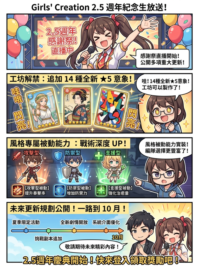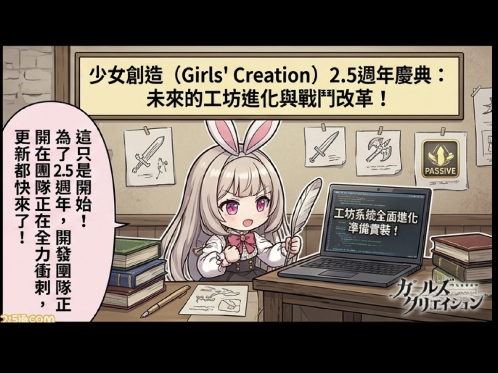 人氣藝術策略遊戲《少女創造(Girls’ Creation)》於昨(28)日舉辦的 2.5 週年紀念生放送中,公開了多項令玩家振奮的重大更新與未來營運規劃。本次更新核心聚焦於「工坊系統」的全面進化與戰鬥機制的深度擴張,展現出開發團隊持續優化遊戲體驗的決心。