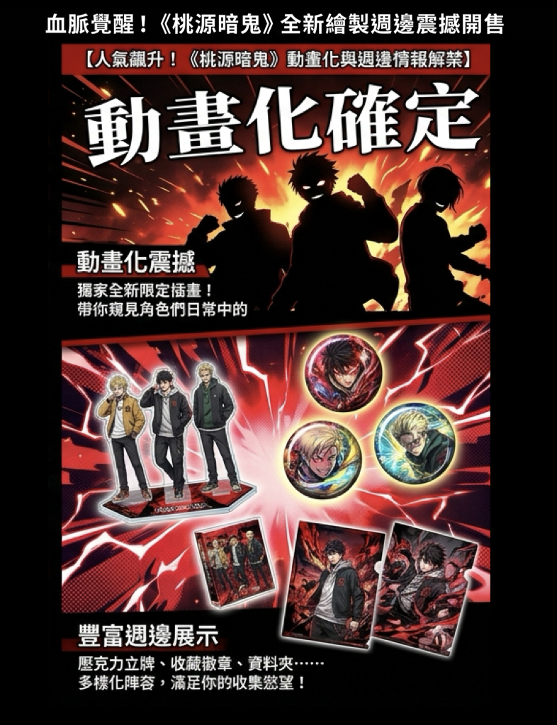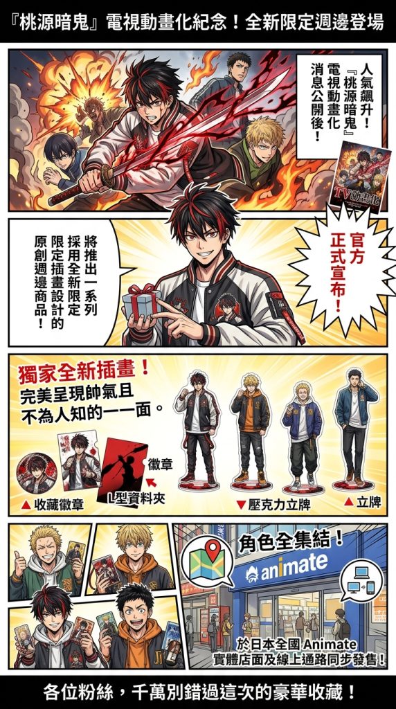 由漆原侑老師創作、以「桃太郎 vs. 鬼」為主題的熱血少年漫畫《桃源暗鬼》,隨著電視動畫化消息的發布,人氣持續飆升,於昨(28)日官方正式宣布,將推出一系列採用全新限定插畫設計的原創週邊商品,並在日本全國Animate(安利美特)實體店面及線上通路同步發售。