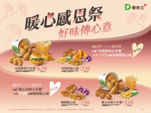 隨著母親節將至,德克士推出「母親節暖心感恩祭.好味傳心意」,以母親節限定套餐結合最低58折起的超值組合,並加碼199元即可帶走豪華點心組,陪伴消費者即日起至05/27節慶檔期,從即將到來的勞動節連假,到母親節團聚時刻,把好味道帶回家,和最重要的人一起分享;同時2026全新推出「德克士 X 味全龍 奔龍而上應援餐」,延續品牌在棒球應援與社群上的高人氣話題,讓母親節餐桌與球迷聚會都多一份酥脆、多一份熱鬧,也多一份真實心意。