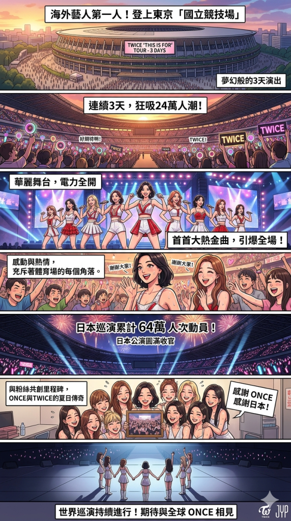 頂級女團 TWICE 再次改寫 K-POP 歷史!最新全球巡迴演唱會「THIS IS FOR」日本場圓滿落幕,TWICE 不僅成為首位登板日本「國立競技場」舉行單獨演唱會的海外藝人,更寫下連續 3 天開唱、累計動員 24 萬人的驚人紀錄。統計顯示,本次日本系列巡演總計吸引了 64 萬名粉絲到場,展現了「亞洲第一女團」無可撼動的統治力。